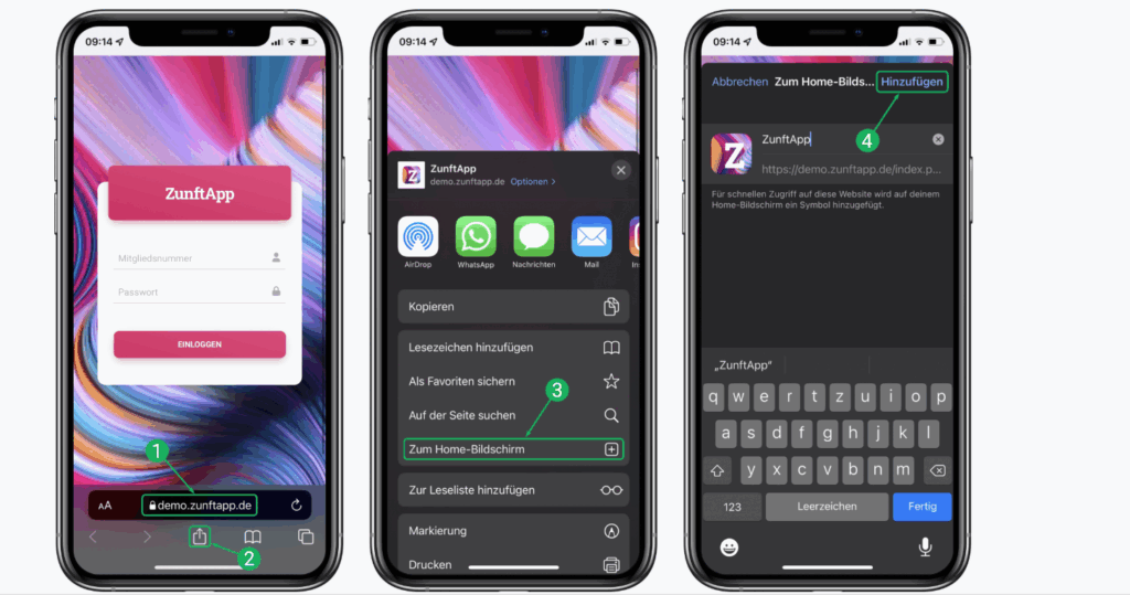 Du kannst der ZunftApp dann noch einen eigenen Namen geben und dann durch einen Klick auf „Hinzufügen“ auf deinem Homescreen installieren.