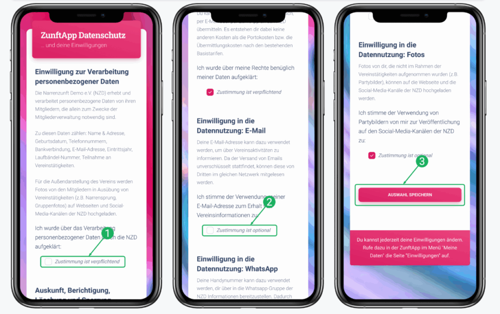 Manche Datenschutz-Themen sind freiwillig und du kannst auch ohne deine Einwilligung die ZunftApp verwenden.